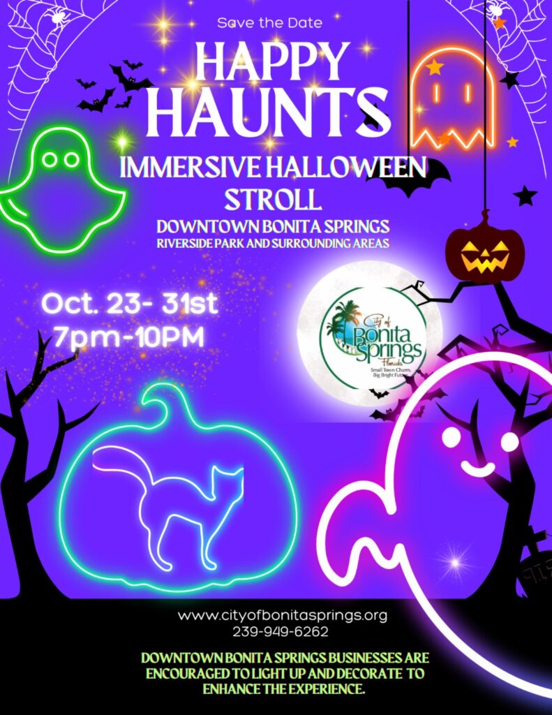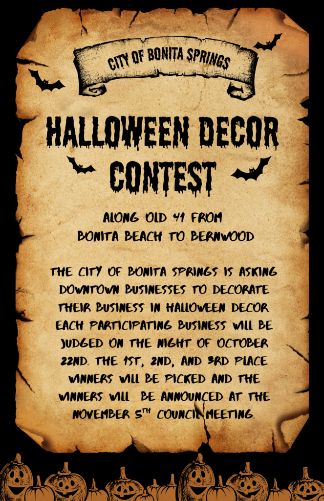 The event is being hosted by the Bonita Springs Downtown Alliance with the support of the business along Old 41. Any business or professional organization is invited to set up a 6’ table along Old 41 Road to hand out candy to trick or treaters. This is a free event; Free to participate and free to attend. If you wish to participate, please email info@ceremonybrewing.com no later than October 10th.